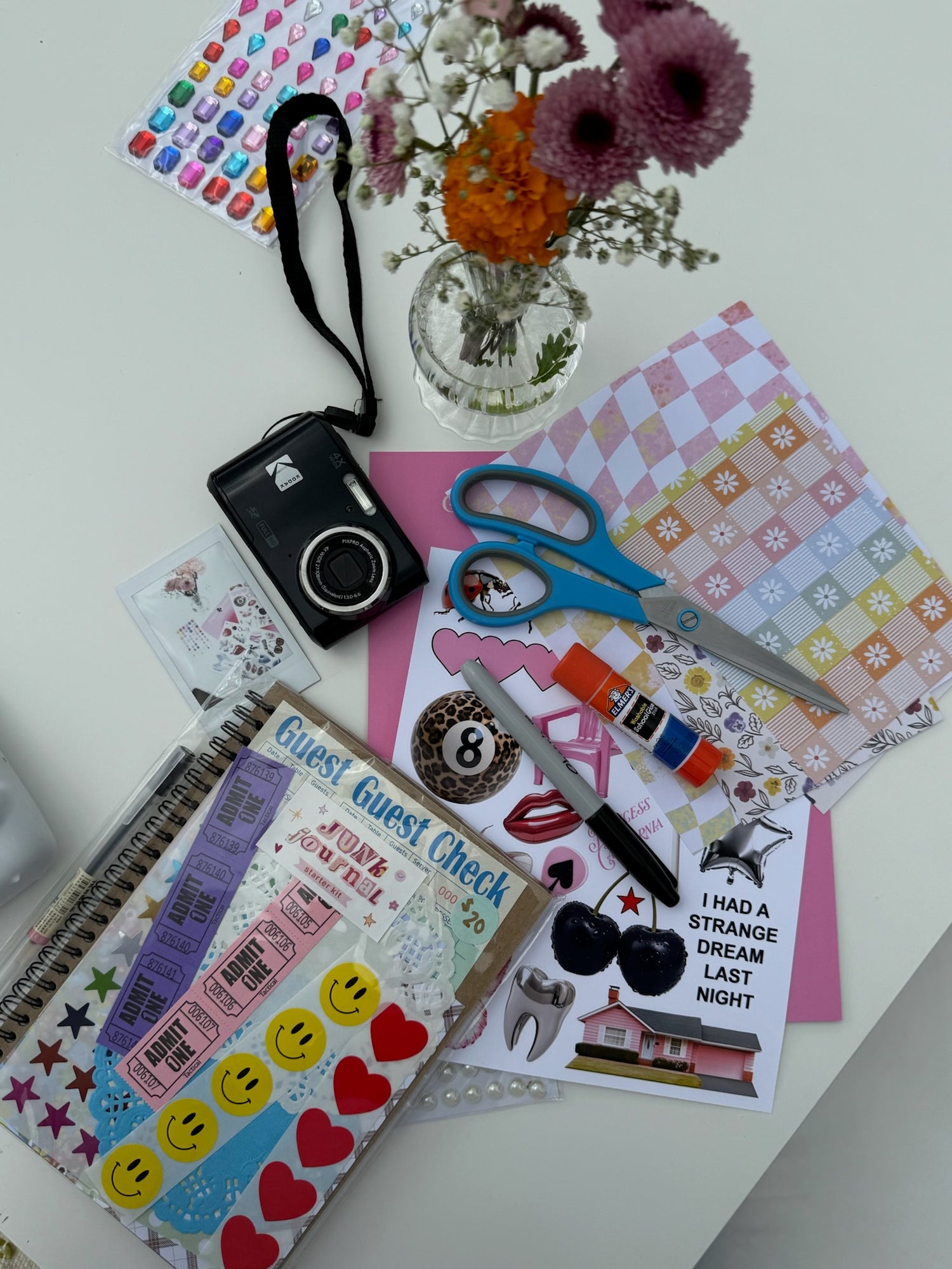 Use anything you have: old book pages, magazines, fabric scraps, ticket stubs, handwritten notes, stickers, washi tape —whatever inspires you. Some other helpful supplies include: